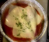 Breaded eggplant rolled w/ricotta and mozzarella baked with tomato sauce and topped with mozzarella.