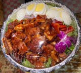 Crispy chicken on top of mozzarella crust drizzled with honey mustard dressing & BBQ sauce.